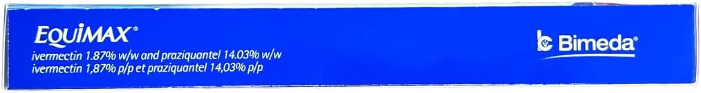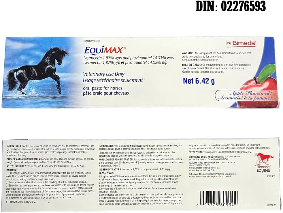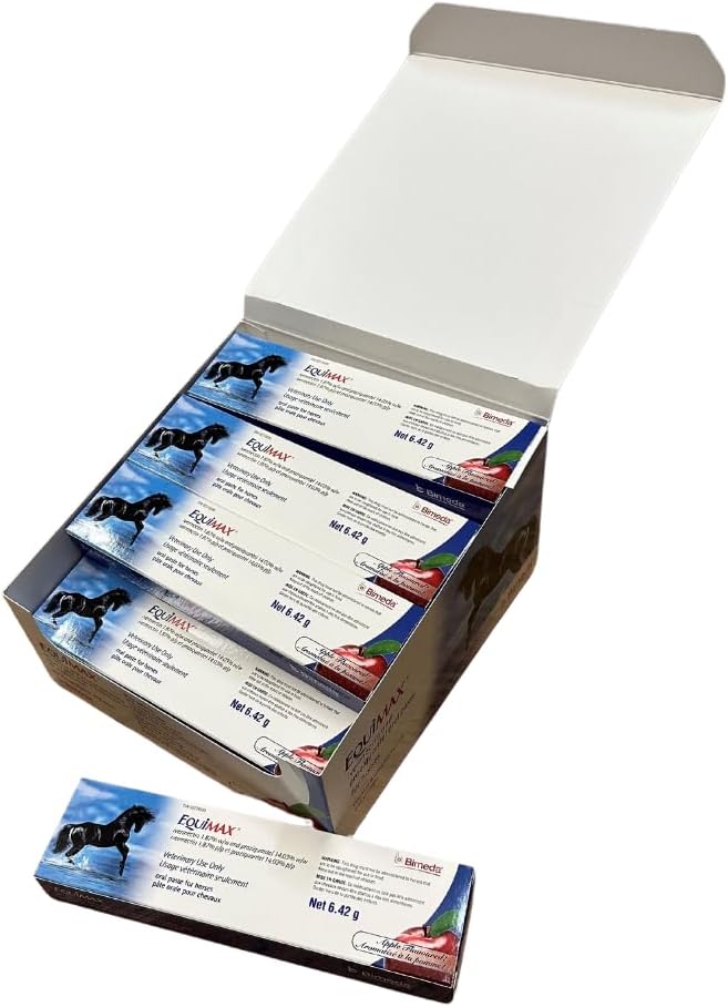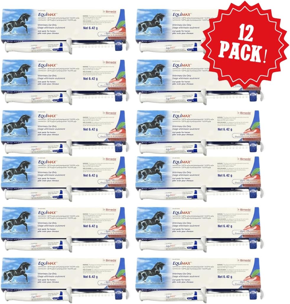 Ensure the health and vitality of your horses with the EQUiMAX Horse Dewormer Apple Flavoured 6.42g x 12 Units. This comprehensive deworming solution combines 1.87% Ivermectin and 14.03% Praziquantel to effectively target and eliminate a wide range of internal parasites, including roundworms, tapeworms, lungworms, and bots. Each apple-flavored paste is designed for easy administration and is safe for all horses, including foals four weeks of age and older, pregnant and lactating mares, and breeding stallions.