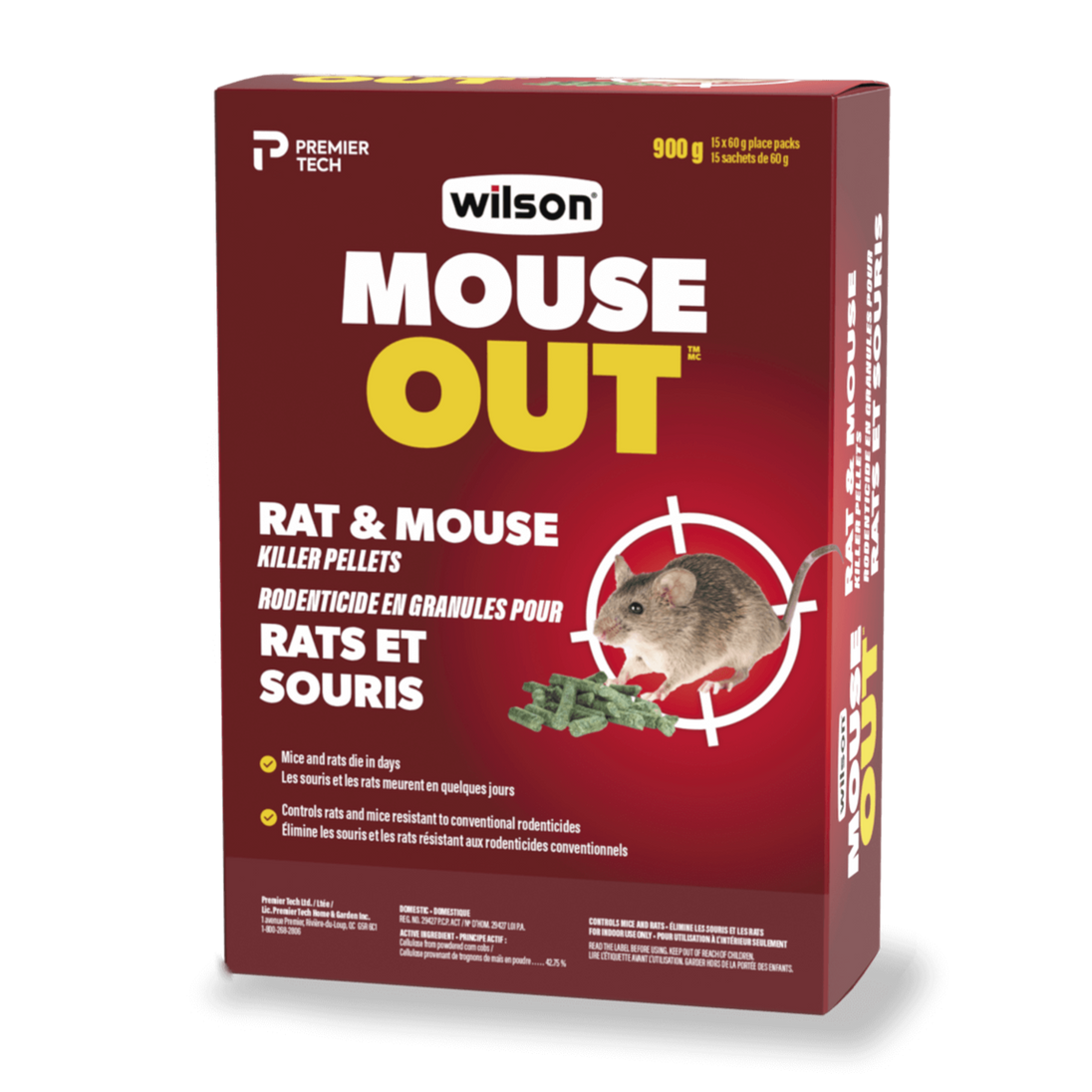 Protect your home, barn, or business from rodent infestations with Mouse Out Rat & Mouse Killer Pellets. This large 900 g container provides effective, fast-acting rodent control designed to eliminate both rats and mice.