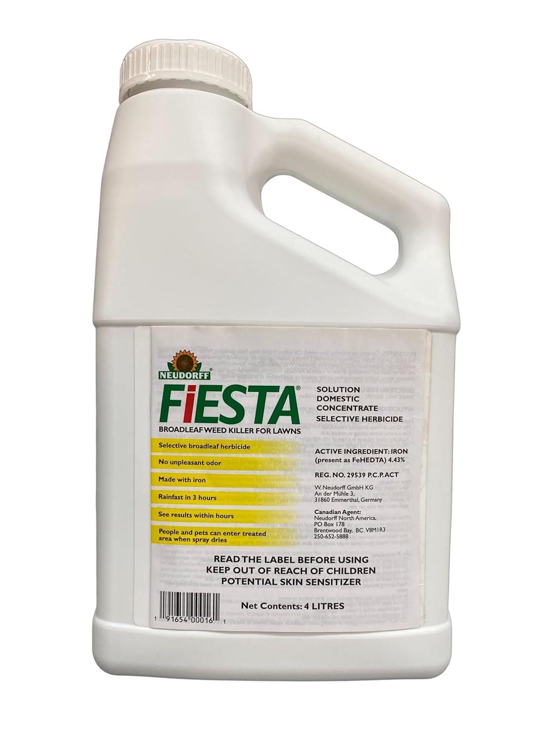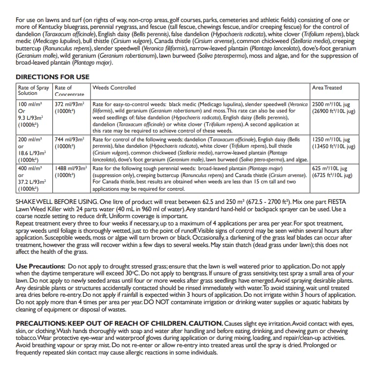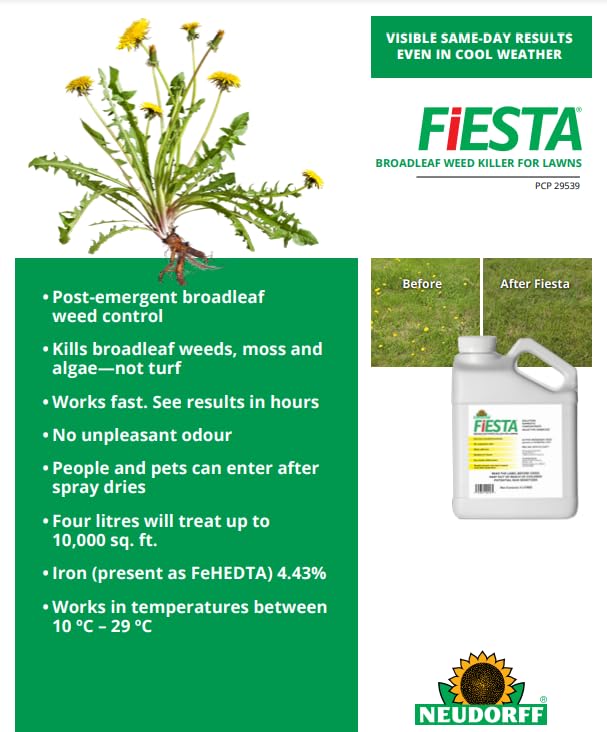 Fiesta Lawn Weed Killer is a selective, broadleaf weed killer that leaves turf healthy and weed-free using a specially formulated iron chelate solution. Fiesta works quickly, delivering visible same-day results, even in cool weather. And since Fiesta is made from iron, it has no unpleasant odor during or after application, and people and pets can reenter the treated area once the spray is dry.